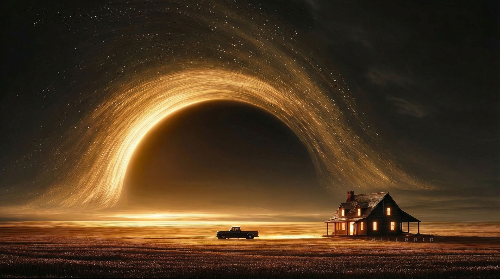 Prompt: Surreal sci-fi landscape featuring a small modern house with warm glowing windows standing alone on a calm shoreline at night. The composition is rotated vertically, creating a gravity-defying perspective. A parked car rests near the house, both illuminated by soft amber interior lights. In the sky, an enormous black hole dominates the horizon, surrounded by a luminous golden accretion disk swirling with glowing particles and star trails. The warm golden light reflects across the water and the ground, blending with deep black and cosmic shadows. Dramatic contrast between warm amber highlights and dark space tones, ultra-detailed, cinematic lighting, long exposure star textures, high dynamic range, epic sci fi realism.