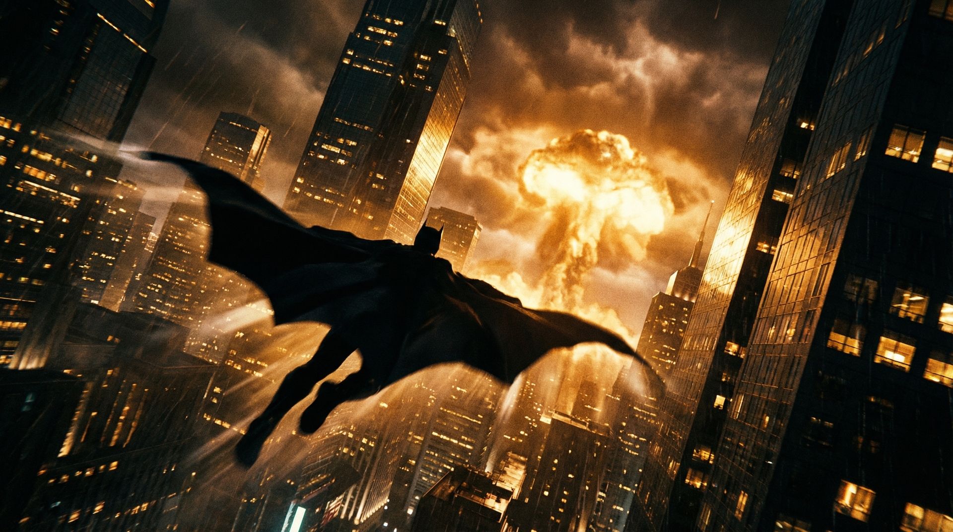 Prompt: Epic cinematic sci fi scene of a dark caped silhouette gliding through a futuristic megacity at night. The camera angle is tilted upward from below, creating a dramatic sense of height and scale. Skyscrapers stretch vertically with golden lights glowing from countless windows. A massive explosion of radiant amber light and smoke bursts at the center of the skyline, illuminating the clouds and casting dynamic highlights across the buildings. The figure’s cape spreads wide like wings, sharply contrasted against the blazing sky. Motion blur and light streaks emphasize speed and descent. High contrast, warm monochromatic gold tones, volumetric lighting, intense atmosphere, ultra-detailed, IMAX style composition.