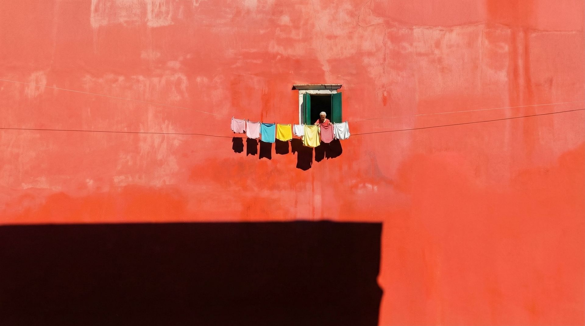 Prompt: Minimalist street photography of a textured coral red exterior wall under strong midday sunlight. A small rectangular window with worn white trim and deep green shutters is centered in the upper frame. An elderly woman with short white hair stands at the window, calmly hanging colorful laundry pink, yellow, blue, and white garments on a clothesline stretched horizontally across the scene. Dramatic hard sunlight creates deep, sharp shadows of the hanging clothes against the red wall. Large negative space dominates the composition, with a bold dark shadow occupying the lower portion of the frame. High contrast, vibrant color palette, documentary style, European street aesthetic, sharp detail.