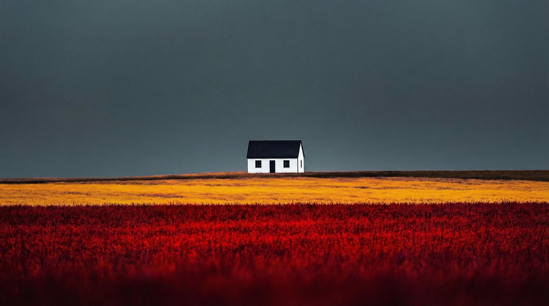 Prompt: Minimalist landscape photography of a small white countryside house with a dark black roof, centered in the frame beneath a vast muted gray-blue sky. The house sits far in the distance on the horizon line. In the foreground, layered fields create bold horizontal color bands deep crimson red flowers in the front, followed by a wide golden yellow field, then a darker earthy strip near the horizon. Dramatic contrast between the saturated red and yellow fields and the moody, desaturated sky. Symmetrical composition, strong negative space in the upper frame, sharp focus, high dynamic range, editorial fine art photography style, ultra detailed, wallpaper aesthetic.