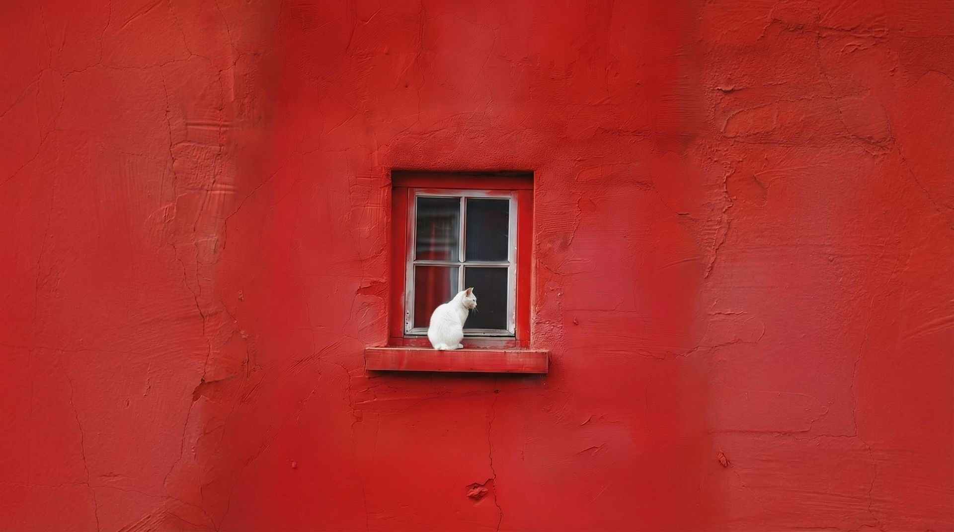 Minimalist fine art photography of a small square window set into a textured, weathered red wall with visible cracks and rough plaster details. A white cat sits calmly on the narrow red windowsill, facing sideways and gazing outside. The window frame is white with four glass panes, slightly reflective, with soft indoor shadows visible behind the glass. Strong color contrast between the vivid matte red wall and the pure white cat. Centered composition, symmetrical framing, subtle natural daylight, sharp focus on textures and fur detail, high-resolution, editorial minimalism.