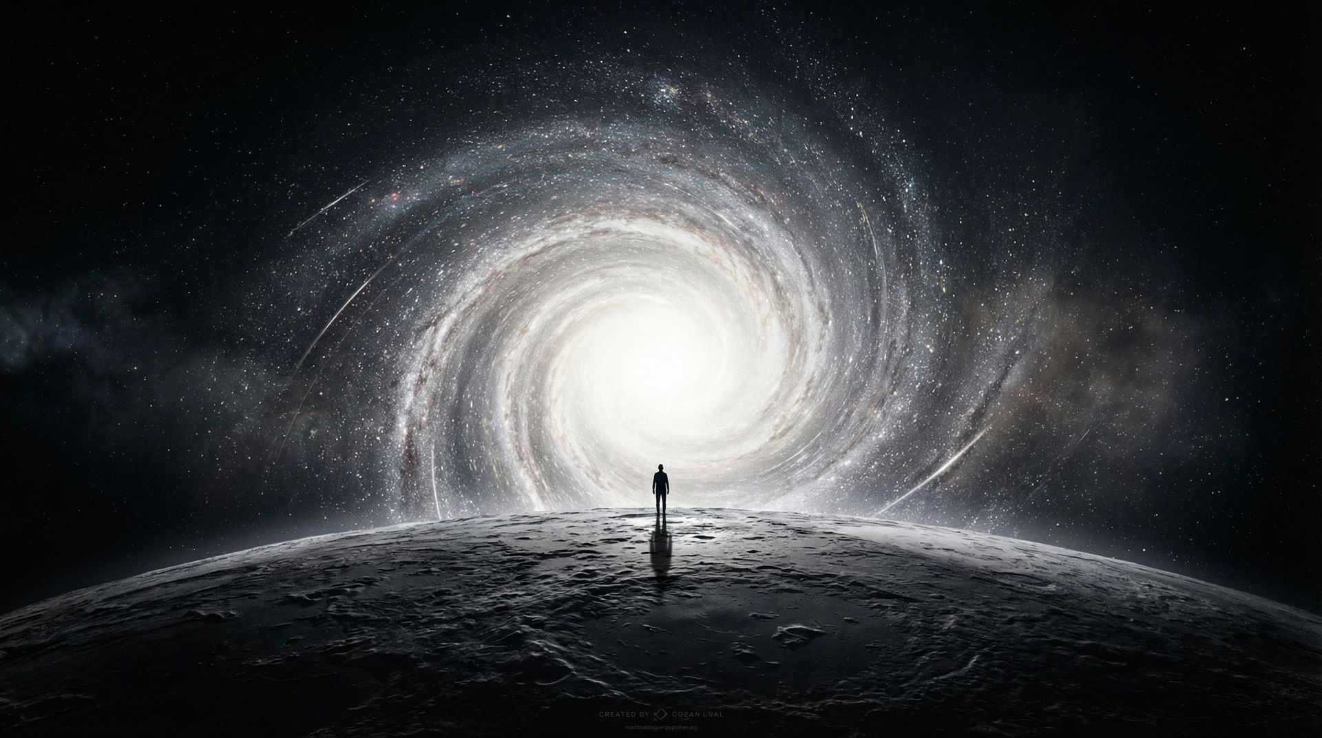Prompt: Epic surreal cosmic artwork of a lone human silhouette standing on a curved, dark planetary surface beneath a massive swirling galaxy vortex. Millions of stars spiral overhead, forming a luminous tunnel that fades from deep black into a radiant white core. The figure stands small against the overwhelming scale of the universe, casting a long shadow across the textured ground. High contrast between the dark foreground and the glowing galactic center. Ultra detailed star field, long-exposure light textures, subtle cosmic dust, dramatic depth, fine art sci-fi aesthetic, cinematic realism, strong negative space.