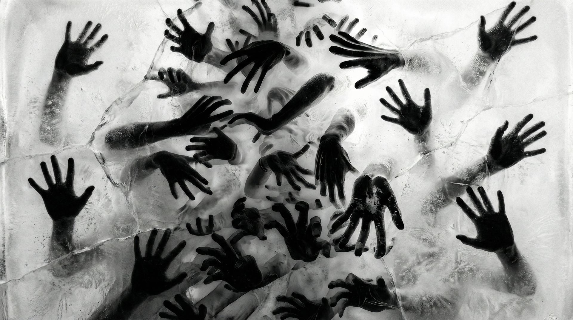 Prompt: High contrast monochrome surreal artwork of multiple human hands and forearms pressing upward against a translucent surface, as if trapped beneath ice or frosted glass. The perspective is from above, looking down at distorted black hands emerging through a milky white, cracked texture. Fingers are stretched and twisted, some blurred by motion, creating a sense of desperation and tension. Dramatic chiaroscuro lighting emphasizes deep blacks against pale, foggy whites. Textured surface details, subtle grain, abstract horror aesthetic, psychological intensity, fine art photography style, ultra detailed.