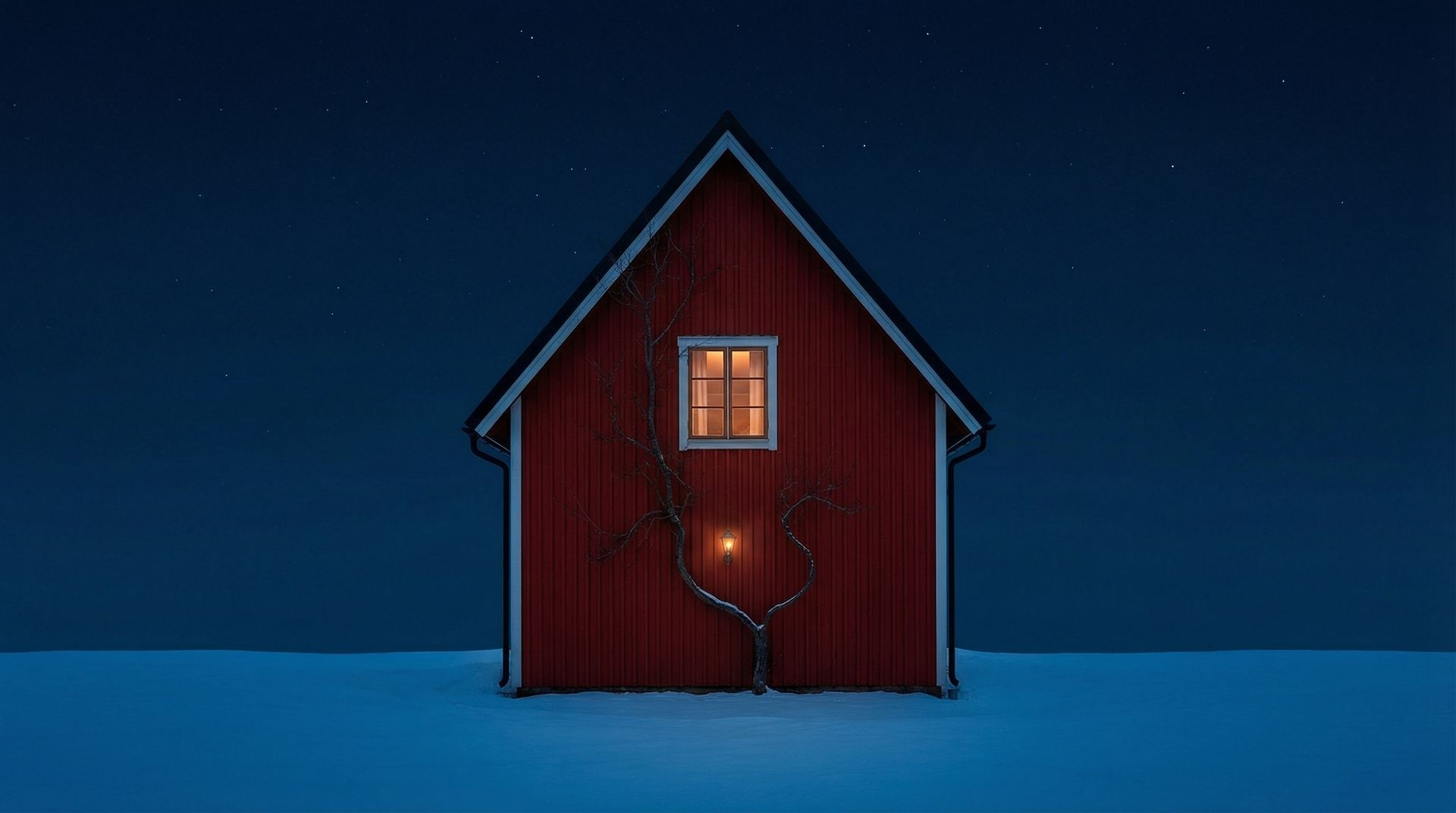 Prompt: Minimalist night photography of a tall red wooden house centered against a deep navy blue sky filled with faint stars. The house has a steep black roof and symmetrical structure, isolated in a snowy landscape. A single warm lit window glows softly in the middle of the house, casting an inviting amber tone that contrasts with the cold blue surroundings. A thin, leafless tree grows along the front wall, its dark branches stretching upward in an organic, almost surreal curve. A small vintage wall lamp beneath the window emits a subtle warm light. High contrast between red facade and dark sky, moody cinematic lighting, sharp focus, fine art photography style, strong negative space, ultra clean composition, vertical wallpaper aesthetic.