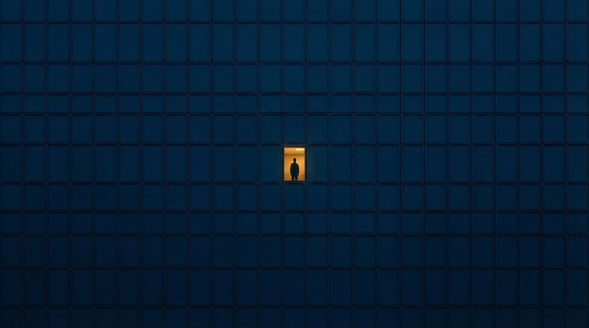 Prompt: Minimalist architectural photography of a large modern building facade covered in deep navy-blue grid panels, forming a perfect geometric pattern across the entire frame. At the exact center, one small rectangular window glows with warm yellow light, breaking the symmetry. Inside the lit window, a single human silhouette stands still, creating a dramatic contrast between isolation and scale. Strong negative space, perfectly centered composition, high contrast between cold blue tones and warm amber light. Clean lines, ultra-sharp detail, cinematic minimalism, fine art photography style, moody atmosphere.