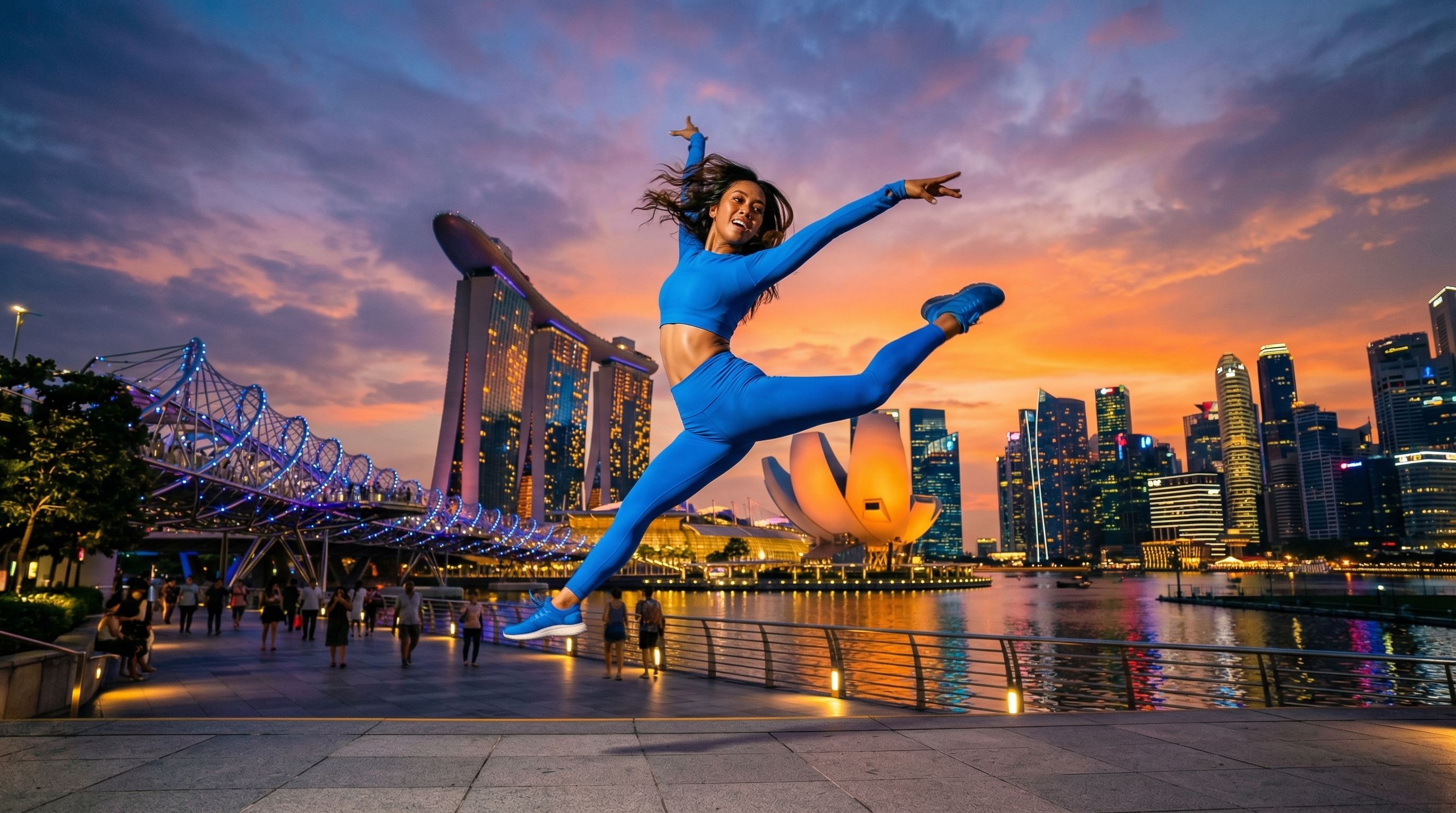 12. Prompt: A dancer leaping high on a glowing riverside promenade at sunset in Singapore, the skyline illuminated with colorful skyscraper lights reflecting on the water, modern suspension bridge glowing with LED lights behind, dramatic orange and purple sunset sky, the dancer wearing vibrant blue athletic clothing frozen mid-air with arms spread wide, cinematic wide angle perspective capturing city energy, reflections shimmering on the river surface, professional urban sports photography style, shot with Sony A1, 24mm lens, f/2.8, ISO 250, 1/2000 shutter, ultra detailed textures and cinematic color grading.