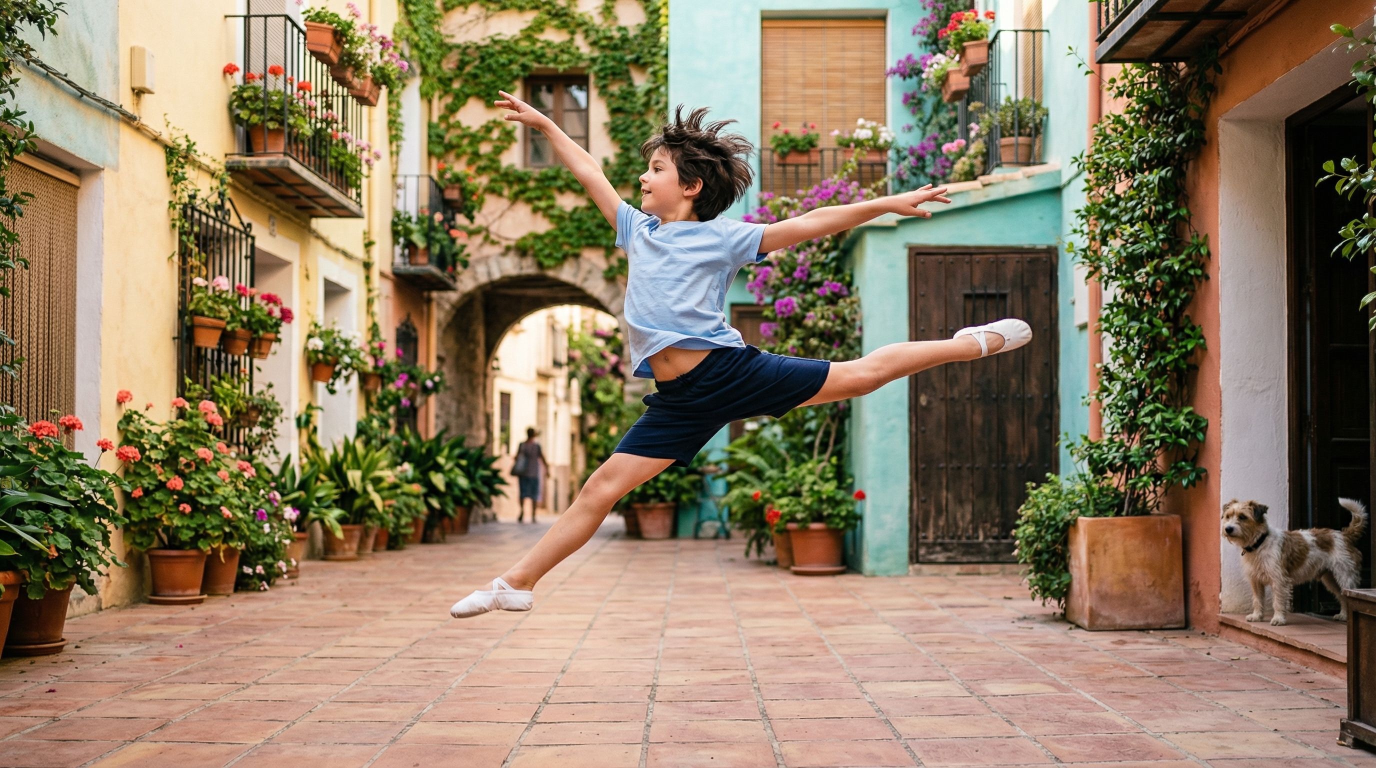 11. Prompt: A young boy performing a powerful ballet-style leap in the middle of a colorful Mediterranean courtyard, terracotta tiled floor glowing under warm afternoon sunlight, pastel yellow and turquoise colonial walls with aged wooden doors behind him, ivy plants climbing the walls, a small brown dog watching near a shaded doorway, vibrant flowers hanging from balconies above, the boy frozen mid-air with perfect body extension, natural wind lifting his shirt slightly, cinematic composition with leading lines of the courtyard tiles, warm summer color palette, captured in ultra-sharp motion freeze, shot on Canon EOS R5, 35mm lens, f/2.8, ISO 200, 1/2000 shutter, professional documentary street photography, vivid natural tones, high dynamic range.