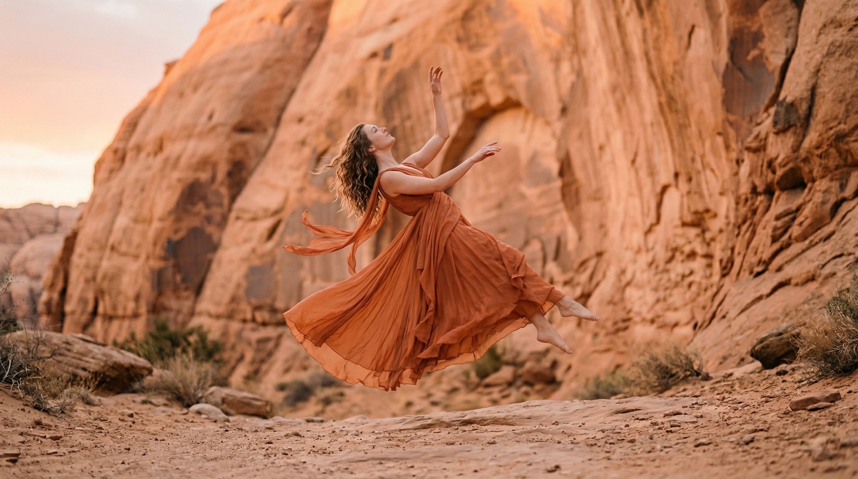 7. Prompt: A young woman floating slightly above the ground against a warm desert canyon wall, wind lifting her hair and clothes, soft sunset light bathing the scene in orange and pink tones, minimalist composition emphasizing the feeling of gravity disappearing, fashion photography with elegant posture and flowing movement, captured with Hasselblad H6D, 80mm lens, f/2.2, ISO 100, 1/1000 shutter, extremely detailed textures and natural colors.