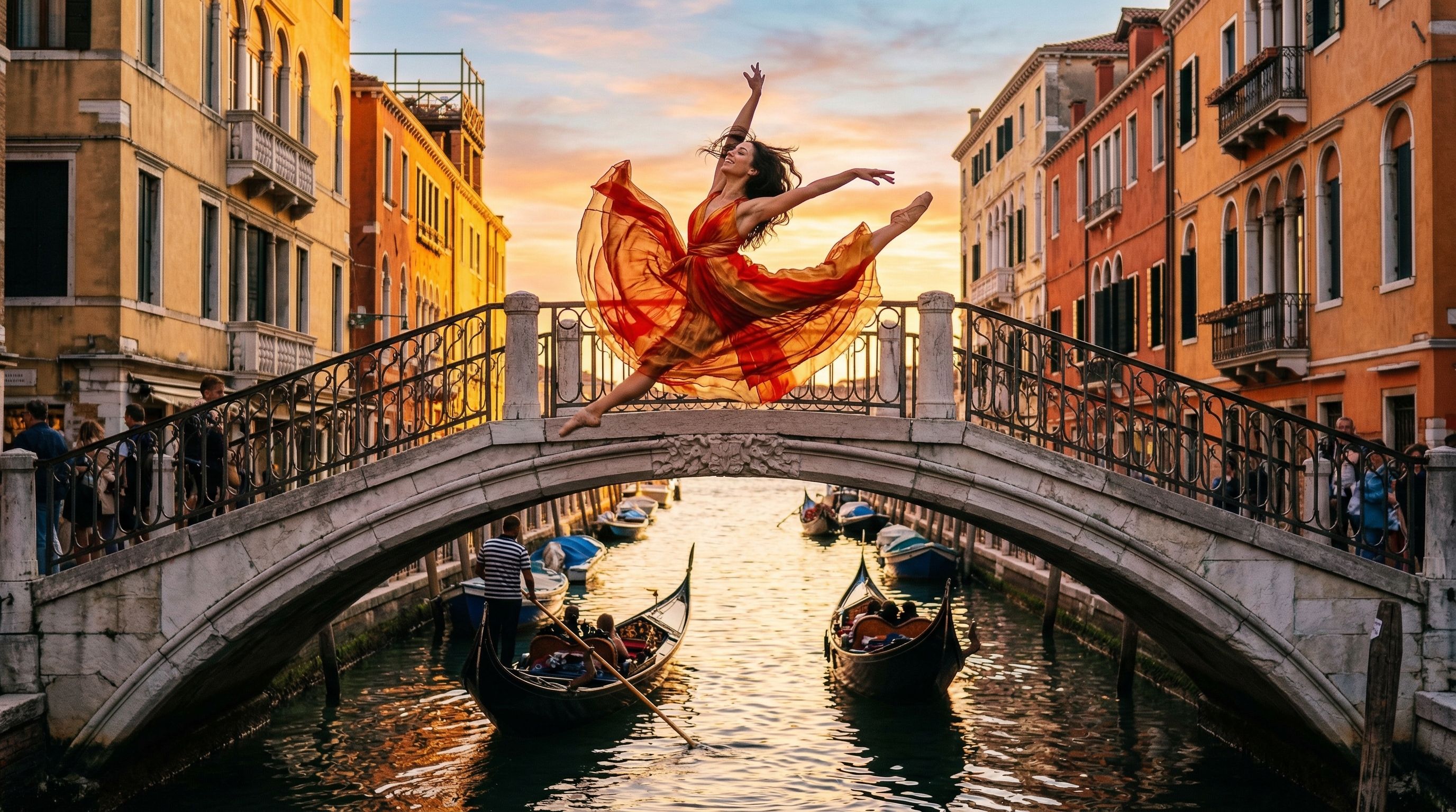 8. Prompt: A dancer leaping high in the middle of a Venice canal bridge at sunset, colorful Italian buildings reflecting in the water, gondolas passing below, dramatic golden sunlight illuminating the dancer mid-jump, vibrant Mediterranean color palette, cinematic travel photography style, Canon EOS R3, 35mm lens, f/2, ISO 160, 1/2000 shutter, motion frozen perfectly with natural elegance.