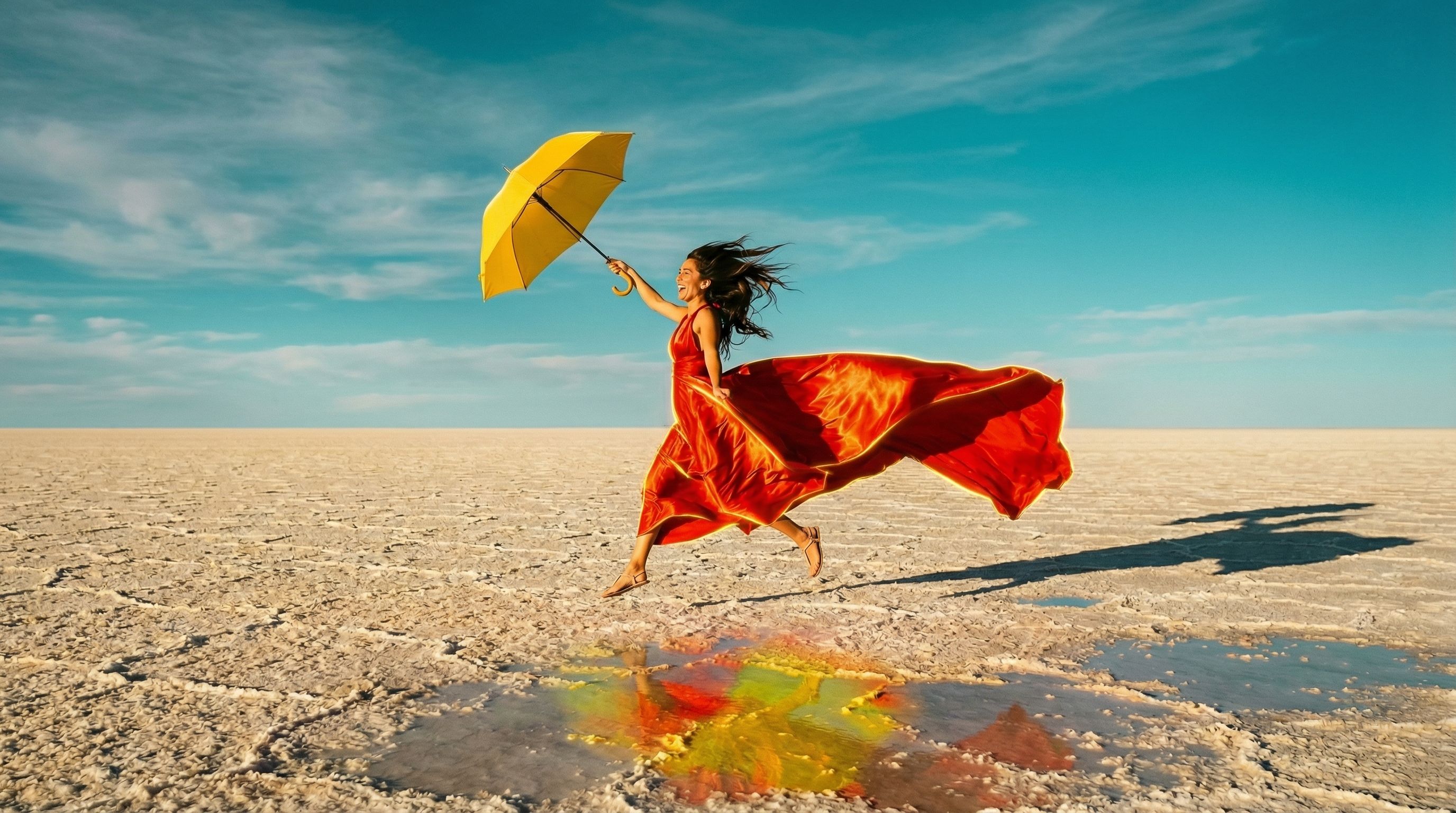 10. Prompt: A stylish woman in a flowing red dress running and leaping across a golden salt desert under a vast turquoise sky, holding a bright yellow umbrella lifted by strong wind, her hair flying dramatically, the umbrella casting colorful reflections across the ground, long shadows stretching across the sand, cinematic wide composition emphasizing isolation and freedom, ultra-clean horizon line, sunlight creating glowing highlights on fabric movement, photographed in editorial fashion style, shot on Hasselblad X2D, 80mm lens, f/2.8, ISO 100, 1/1600 shutter, ultra high resolution, dreamy atmosphere with rich warm tones.
