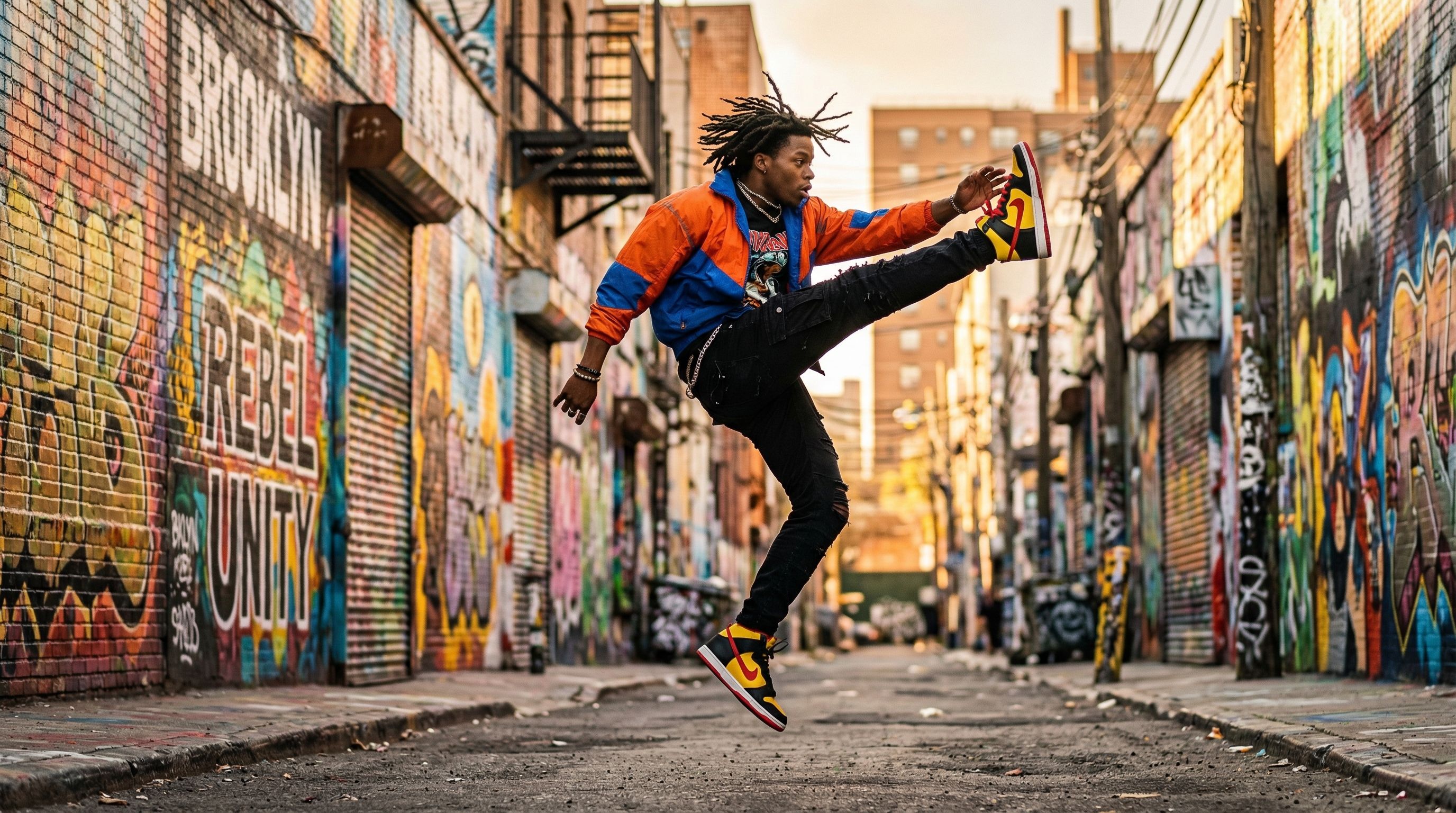 3. Prompt: A rebellious street dancer jumping high in a graffiti-covered alley in Brooklyn, colorful murals covering brick walls, dramatic golden hour sunlight bouncing off buildings, sneakers frozen mid-kick above the pavement, vibrant street fashion aesthetic, urban lifestyle photography, shallow depth of field with cinematic color contrast, shot on Fujifilm GFX100, 45mm lens, f/2.8, ISO 200, 1/1600 shutter, bold street culture energy.