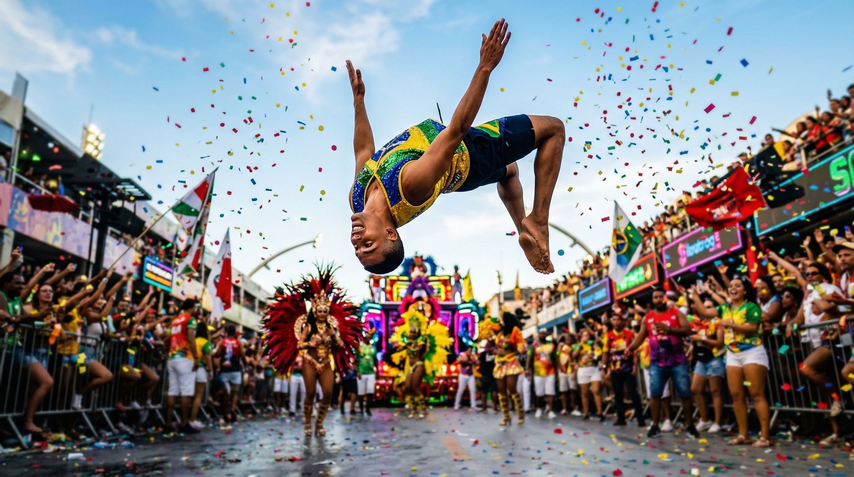 4. Prompt: Ultra dynamic street photography of a young man performing a mid-air flip above a vibrant Rio de Janeiro street during carnival, colorful confetti exploding through the air, samba dancers and neon parade lights in the background, bright tropical sunlight casting long shadows, the subject frozen upside down at the peak of motion, dramatic perspective from a low-angle lens, cinematic color grading with saturated reds and yellows, motion blur on background crowd but razor sharp subject, shot on Leica SL2, 35mm lens, f/2.8, ISO 200, 1/2000 shutter, professional sports photography, editorial magazine style, high contrast, ultra-detailed textures, natural skin tones.