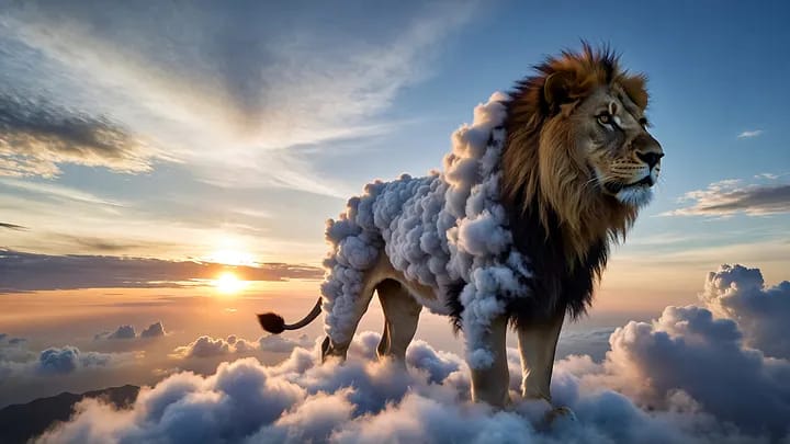 Image prompt: A surreal fantasy illustration of a lion made entirely of clouds standing in the sky at sunset, soft glowing light, dreamy atmosphere, imaginative concept art