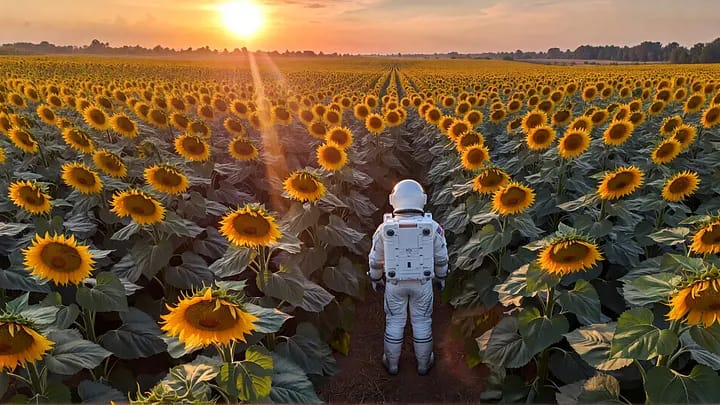 Image Prompt: A cinematic wide shot of a lonely astronaut standing in a vast sunflower field during golden hour, dramatic lighting, emotional atmosphere, painterly style, high detail