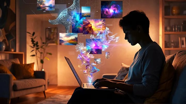 Image Prompt: A creative human silhouette typing on a laptop, glowing AI interface projecting imaginative images into the air, floating art concepts, warm futuristic atmosphere, cinematic lighting, digital illustration.