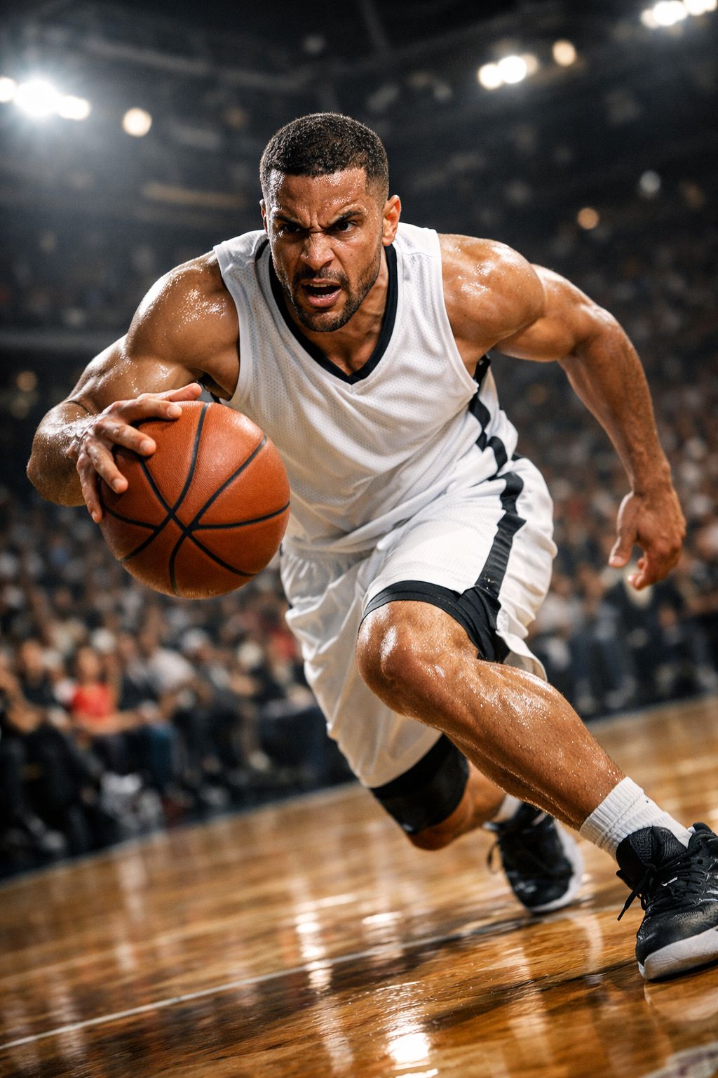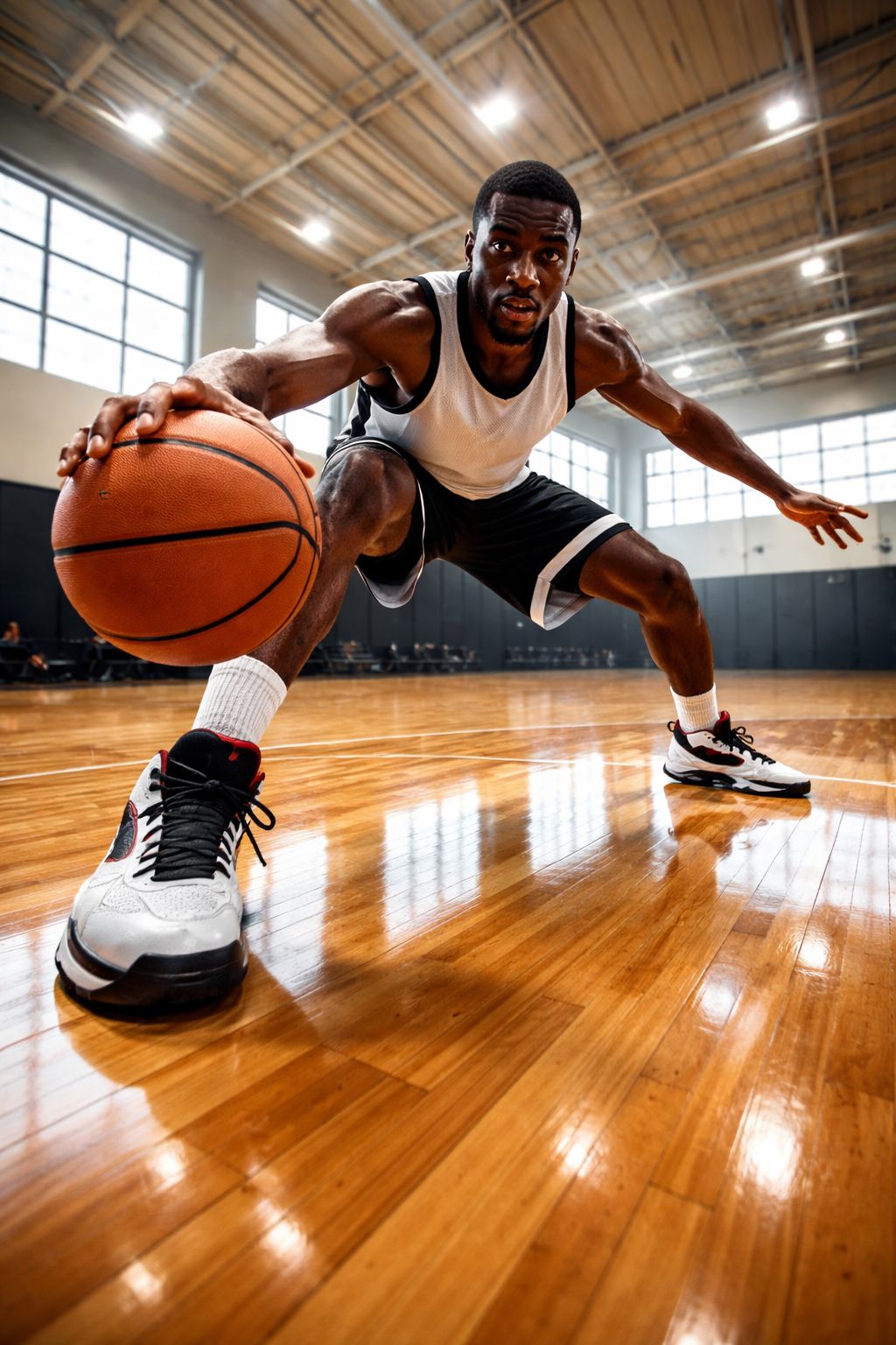 Prompt: A basketball player driving low across an indoor court, extreme low-angle perspective from floor level, one hand controlling the ball close to camera, wide athletic stance, modern sneakers sharply visible, wooden court reflections, bright gym windows, fast movement, dynamic sports advertisement style, realistic indoor lighting, clean architectural background, crisp textures, high energy, ultra realistic, vertical sports photography.