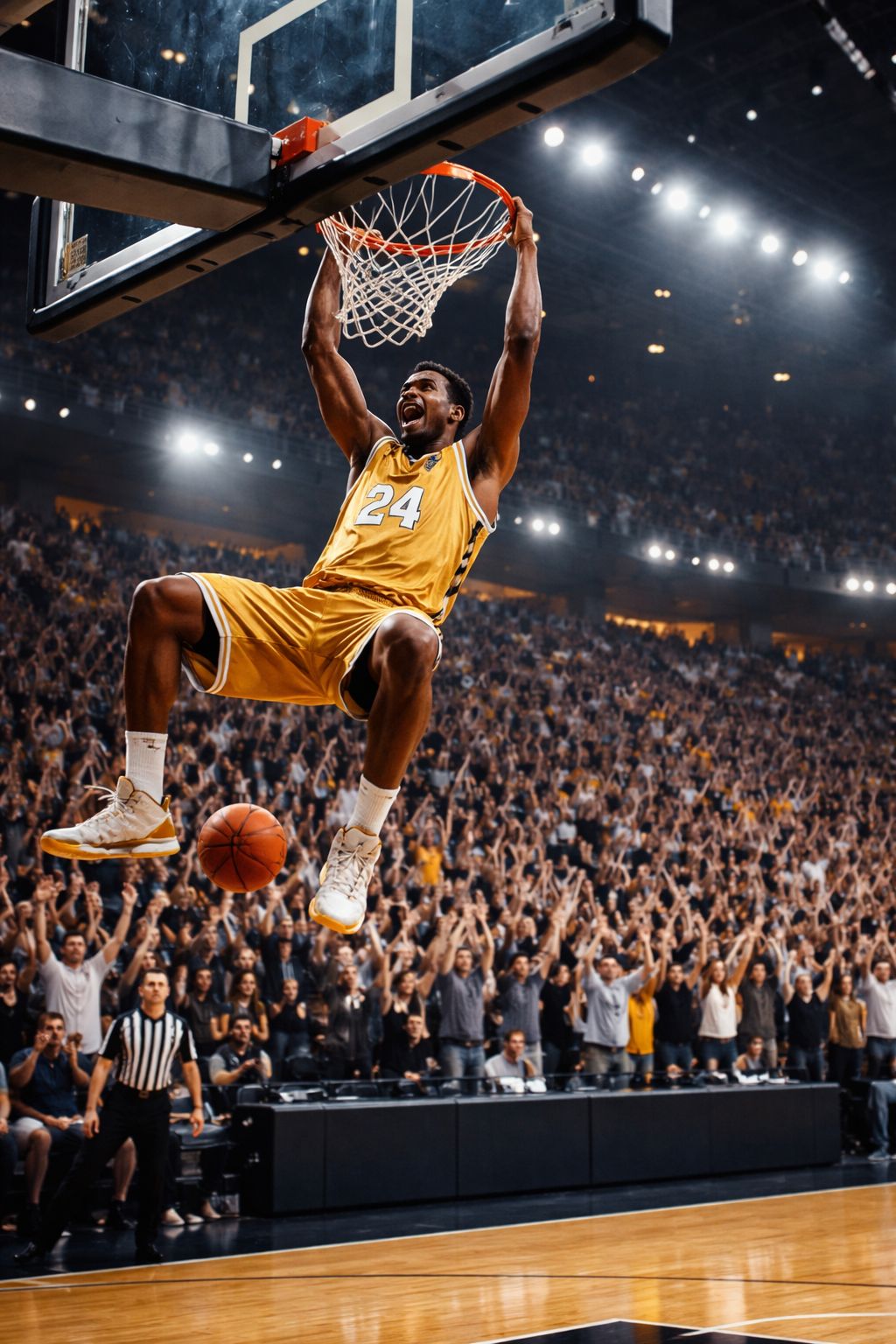 A basketball player hanging on the rim after a powerful dunk in a packed indoor arena, dramatic wide sports shot, crowd reacting in the background, referee and sideline visible below, gold uniform, ball falling beneath the hoop, triumphant post-dunk moment, realistic arena lighting, high-energy game atmosphere, documentary sports photography, crisp action freeze, cinematic realism, vertical composition..