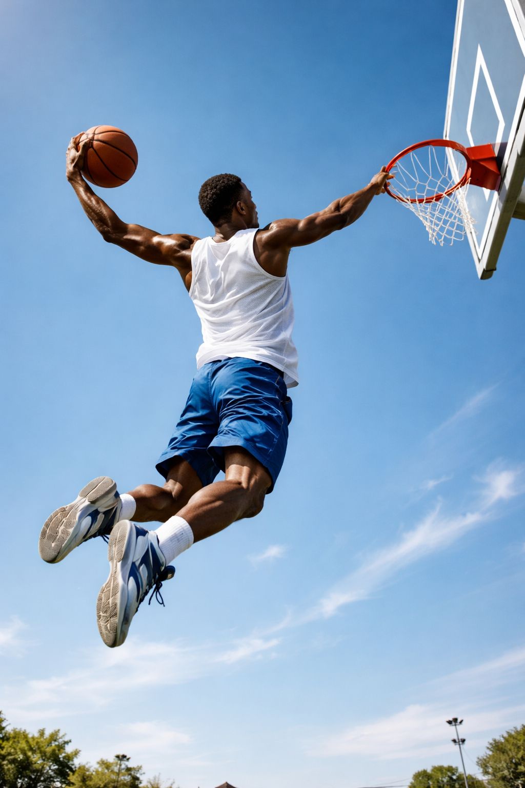 Prompt: A high flying basketball player captured from behind in mid-air, right hand palming the ball, left hand stretched toward the rim, explosive dunk moment on an outdoor court, low-angle shot, massive open blue sky filling most of the frame, athletic body tension, white sleeveless jersey with blue shorts, bright midday sunlight, crisp shadows, clean summer atmosphere, frozen action, ultra realistic sports photography, dynamic composition, editorial sneaker campaign style, sharp detail, cinematic realism, vertical composition.
