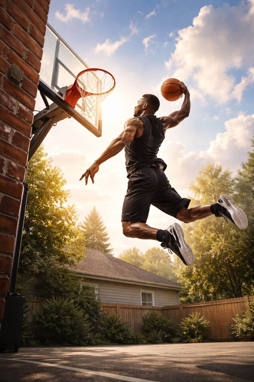 Prompt: A basketball player flying toward an outdoor hoop in a backyard court setting, dramatic low-angle shot from near the brick wall, black sleeveless athletic outfit, bright sky with soft clouds, sun flare near the backboard, one-hand tomahawk dunk motion, suburban rooftop in the background, powerful leap, warm summer light, realistic sportswear commercial style, cinematic energy, ultra detailed, vertical composition.