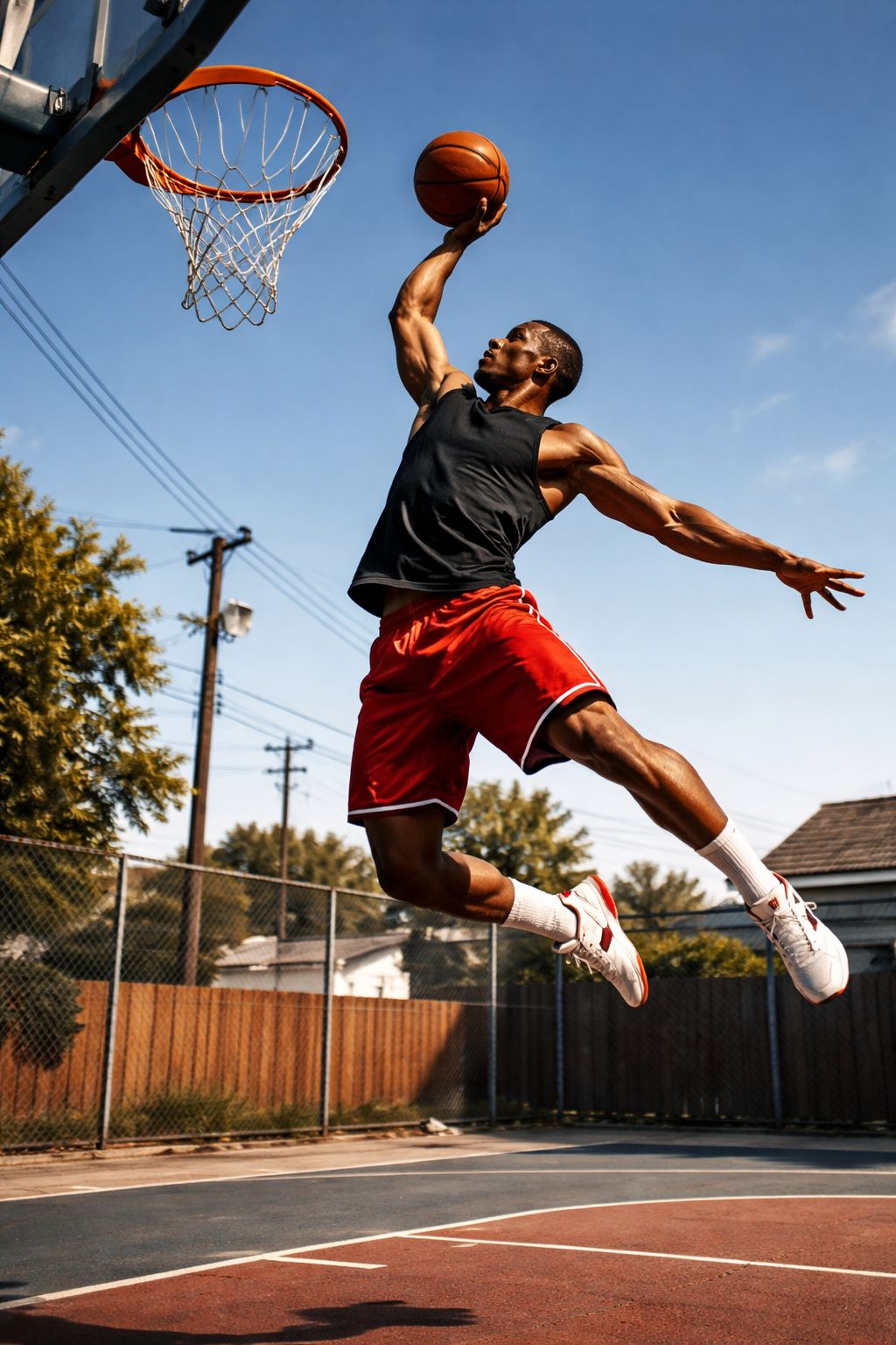 Prompt: A muscular basketball player soaring for a one-hand layup under the hoop on an outdoor neighborhood court, dramatic low-angle shot, black sleeveless top, red shorts, white socks, urban suburban background with fences, rooftops and utility poles, clear blue sky, spring daylight, energetic streetball feeling, suspended mid-air, realistic sports ad style, high contrast, sharp details, cinematic vertical composition.